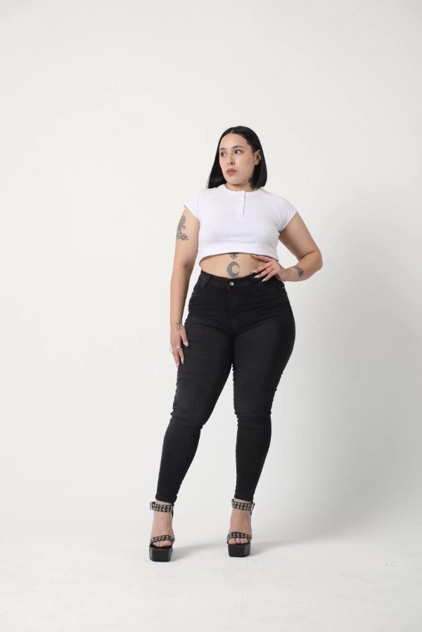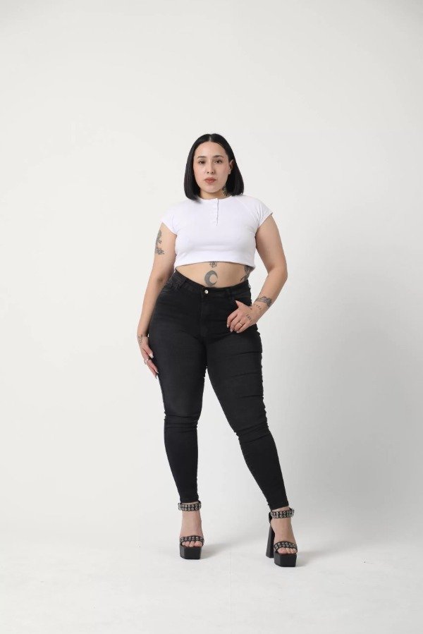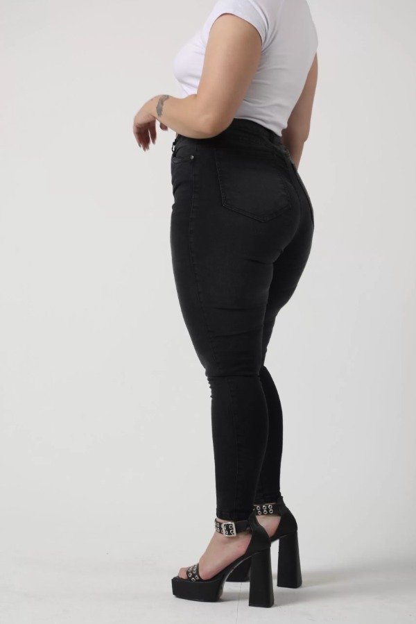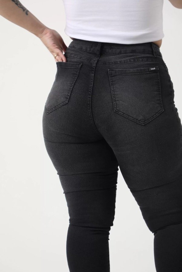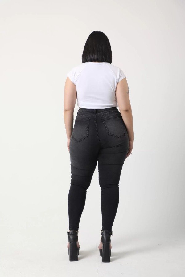 Elastizado, tiro alto, bolsillos delanteros y traseros, ruedo normal. Detalle de partes semilocalizadas (partes mas claras en los muslos).