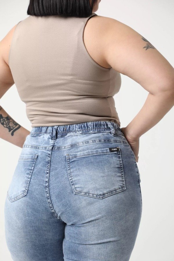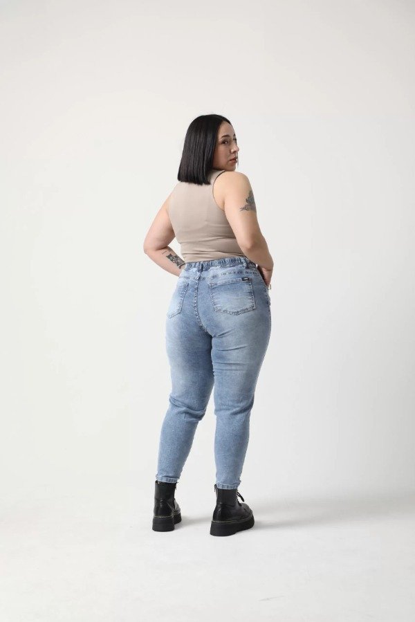Elastizado, tiro alto, bolsillos delanteros y traseros, elastico en la parte trasera de la cintura.