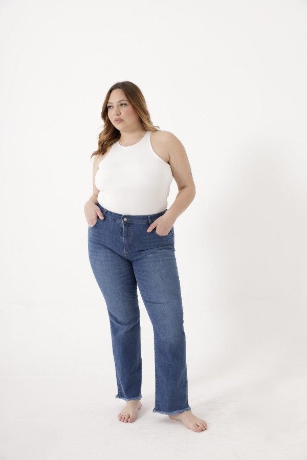 Elastizado, tiro alto, bolsillos delanteros y traseros, ruedo desflecado, detalle de bigotes.