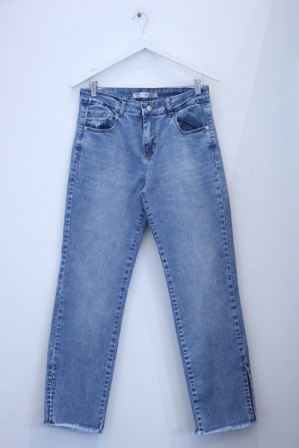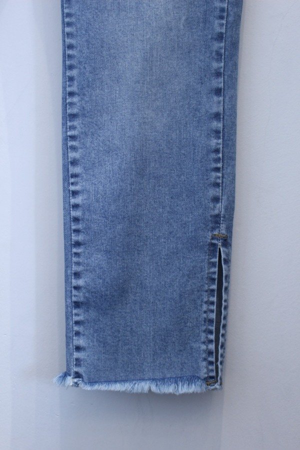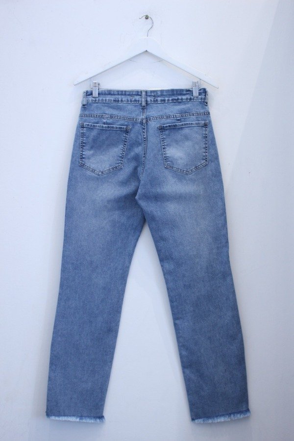 Elastizado, tiro alto, bolsillos delanteros y traseros, ruedo desflecado, terminación con tajo.