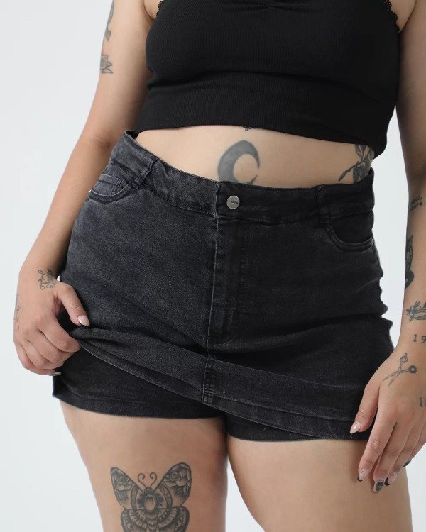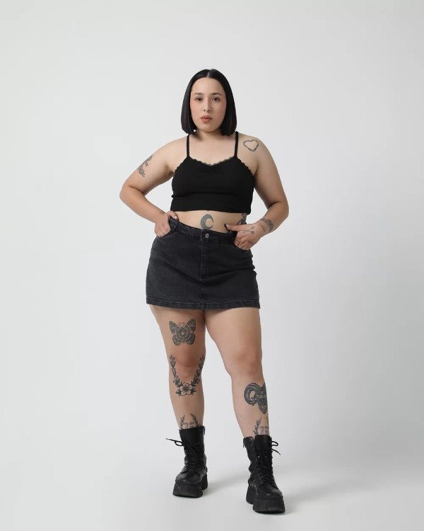 Elastizado, tiro alto, bolsillos delanteros y traseros. Solapa delantera como pollera.