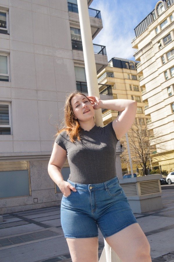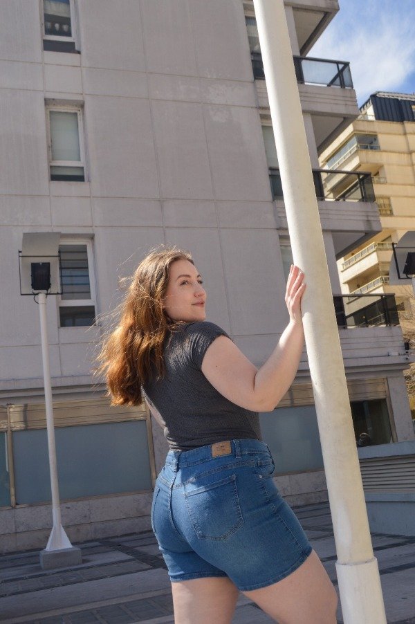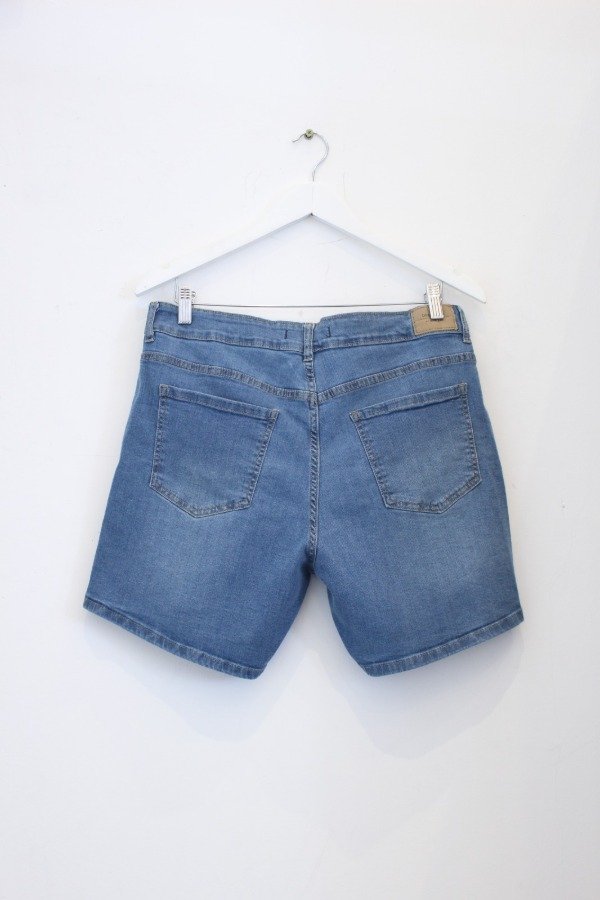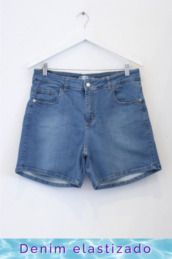 Denim azul, elastizado, tiro alto, bolsillos delanteros y traseros.