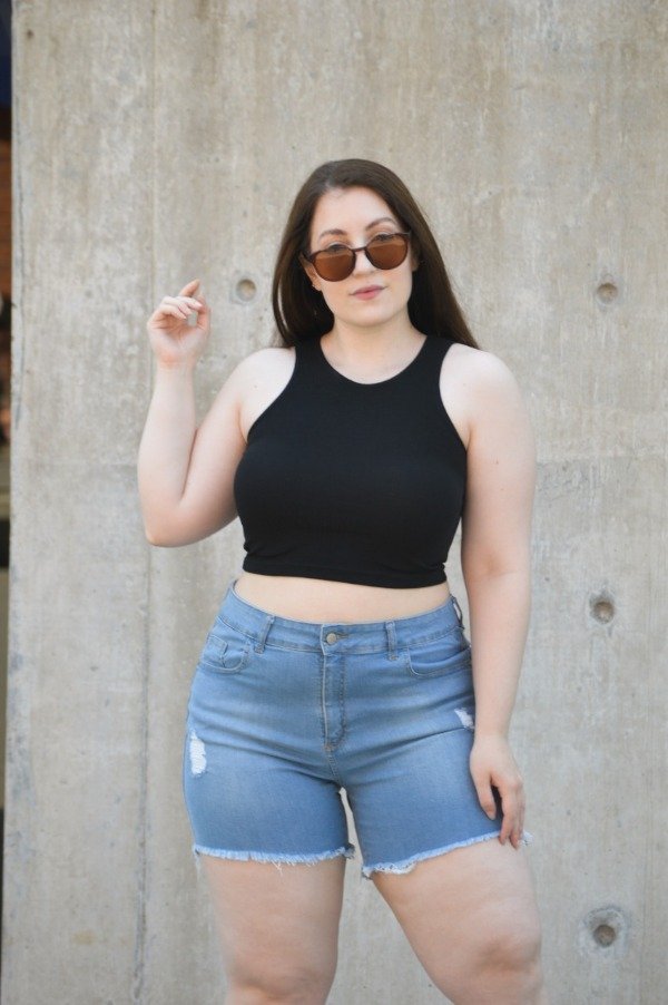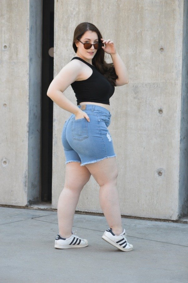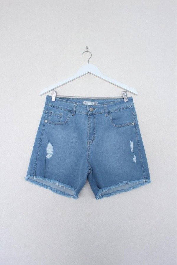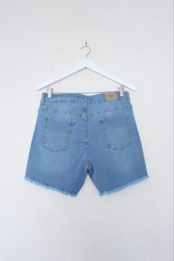 Denim azul claro, elastizado, tiro alto, bolsillos delanteros y traseros