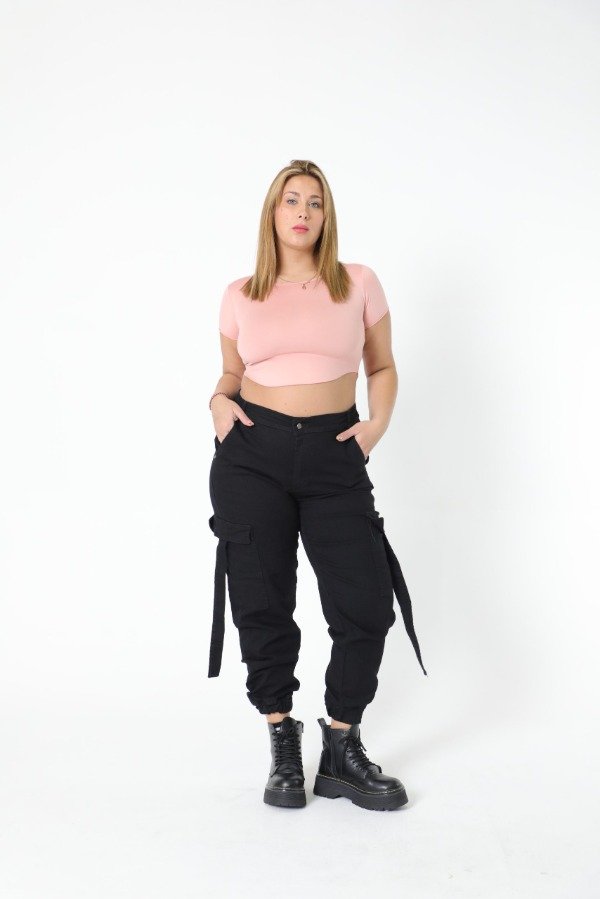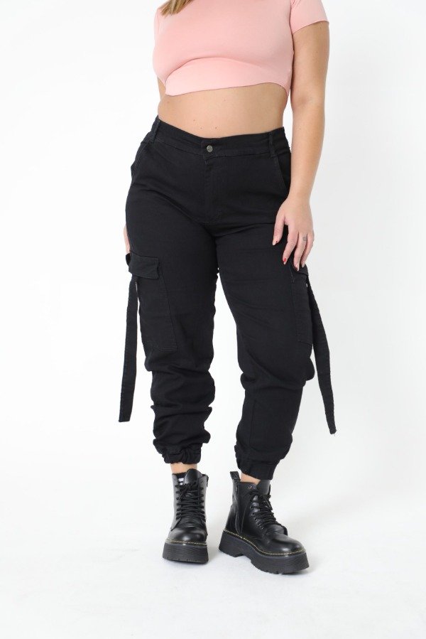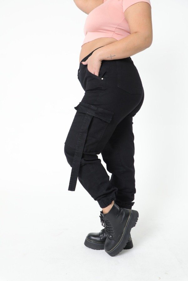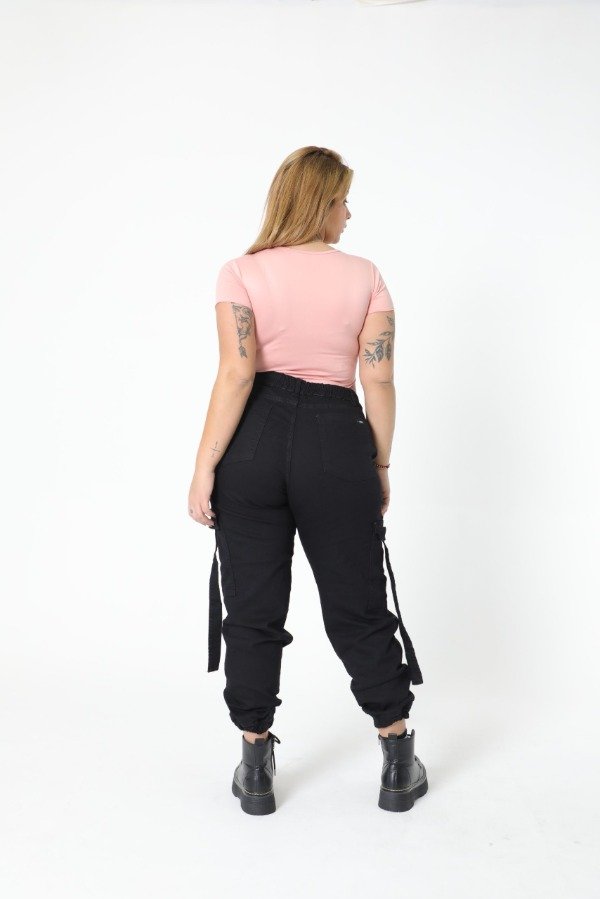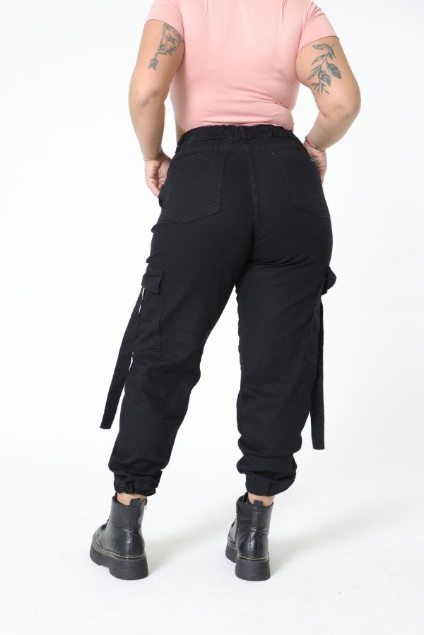 Tiro alto, elastico en la parte trasera de la cintura, puño en los tobillos, bolsillos delanteros y traseros, tiras en los bolsillos cargo laterales.