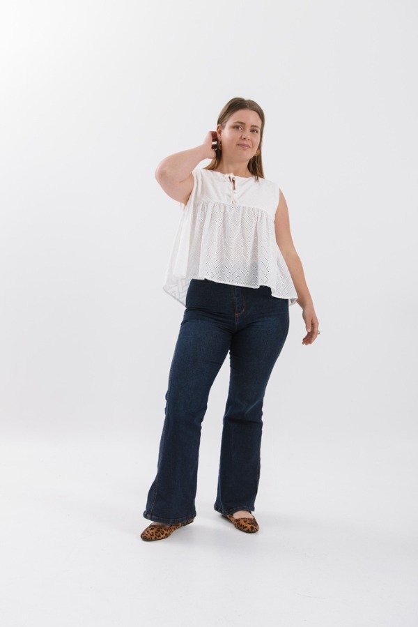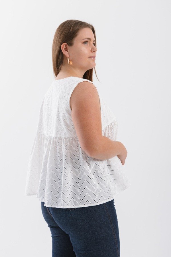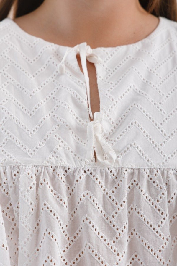 Semielastizado, cuello redondo con detalle de tira, frunce en el busto, semievase.