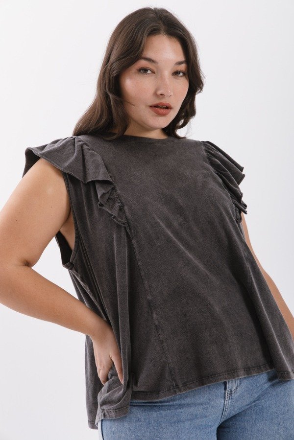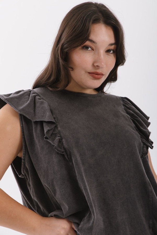 Tela semielastizada, cuello redondo, volados en el frente y la espalda, sin mangas.