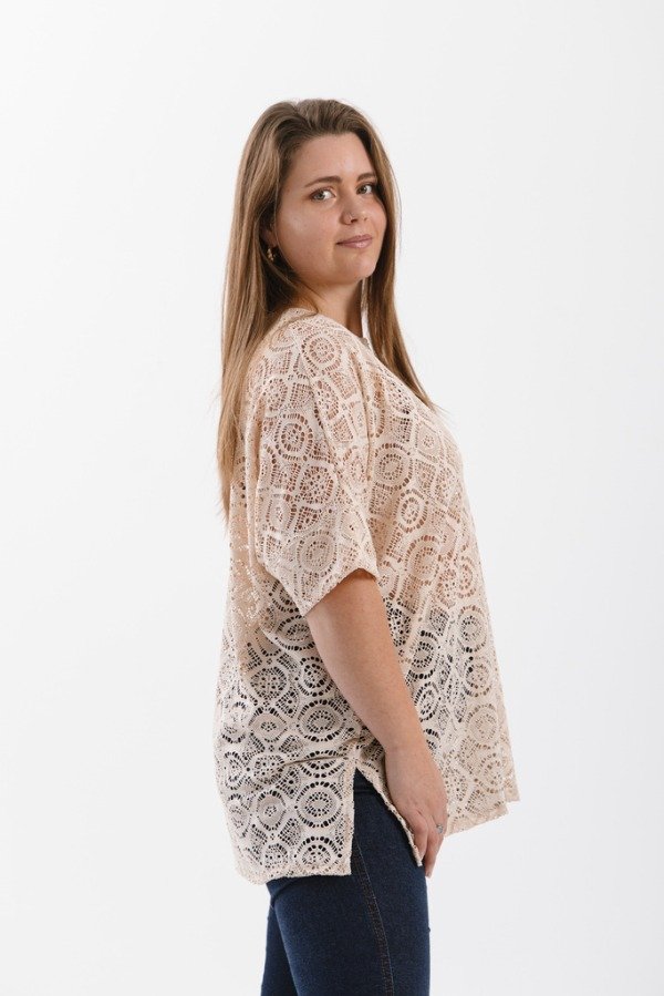 Semielastizado, cuello redondo, mangas cortas, tajos laterales.