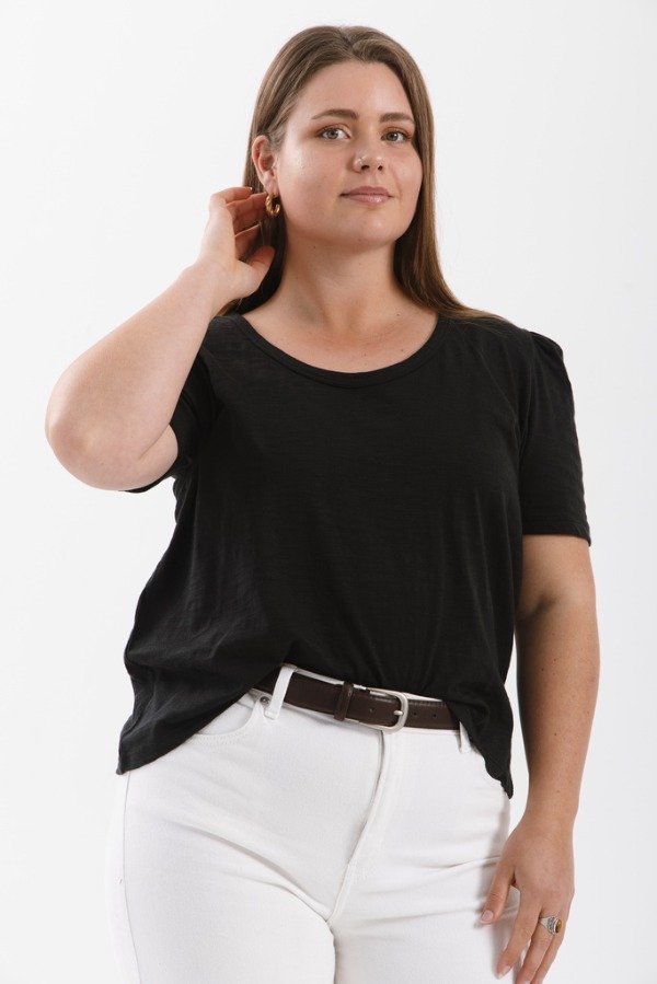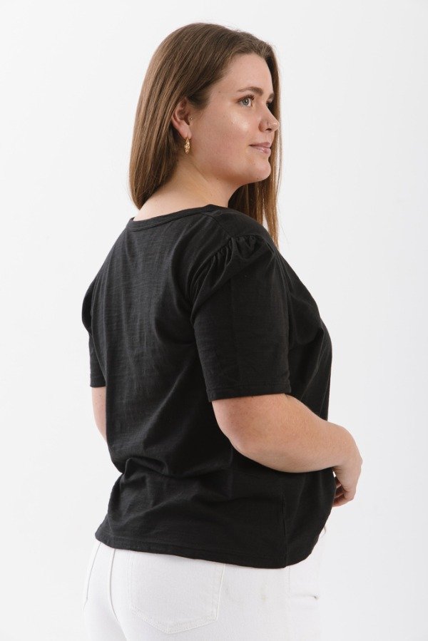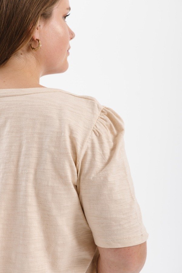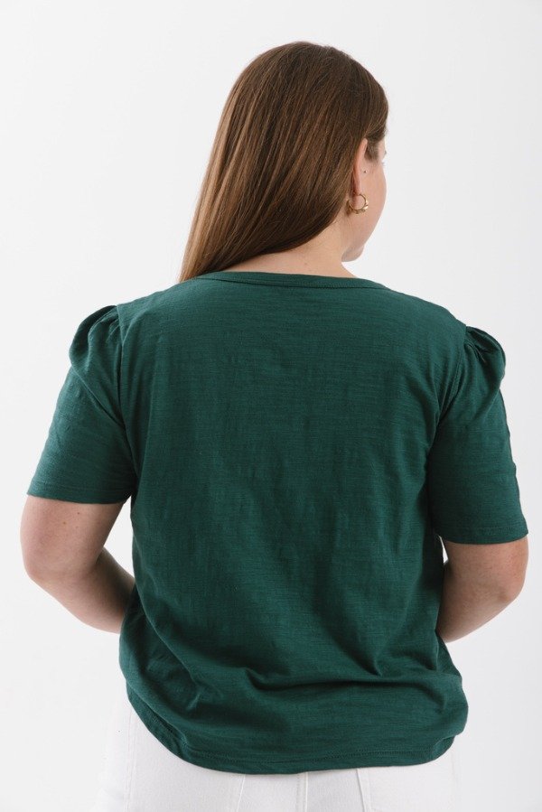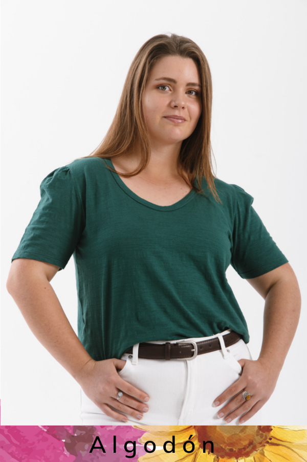 Semielastizada, escote en V, pequeñas pinzas en los hombros.