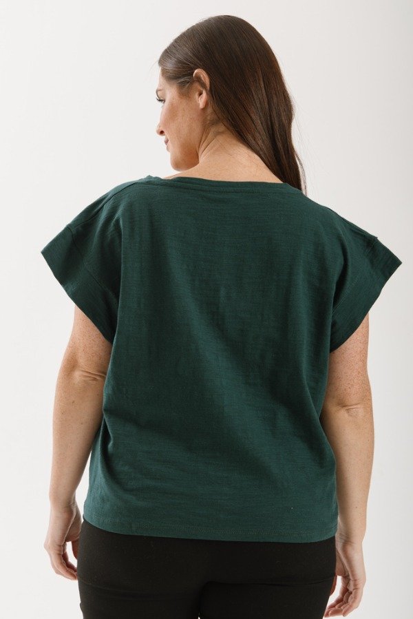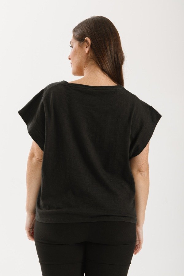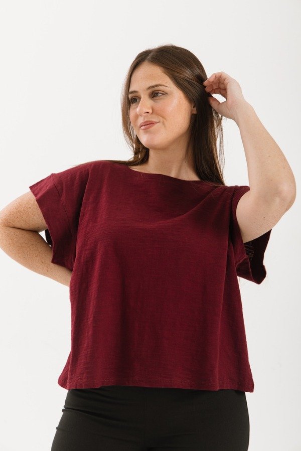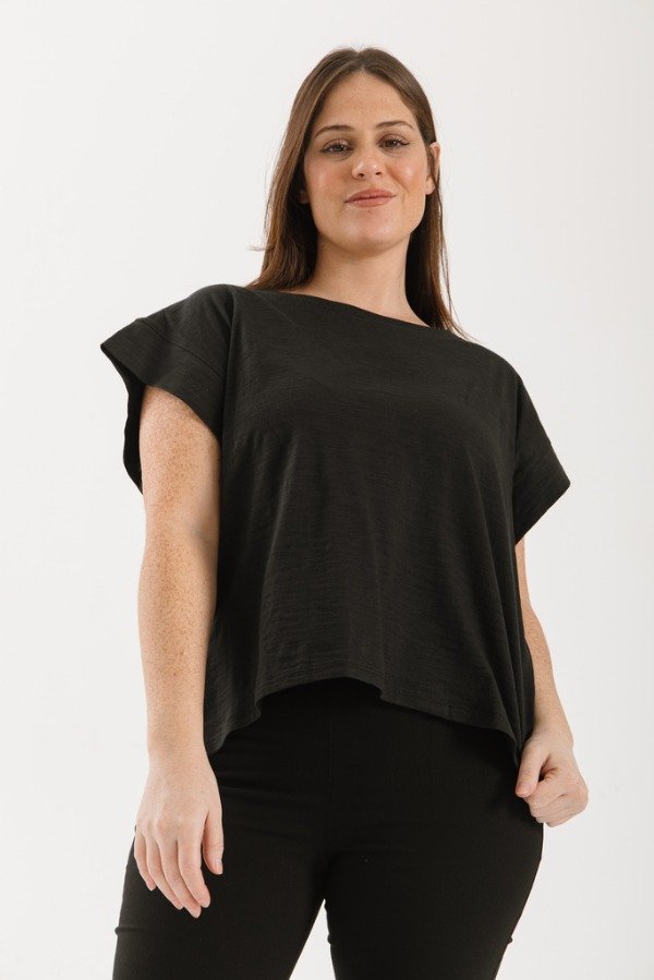 Semielastizada, cuello redondo, mangas anchas caidas.