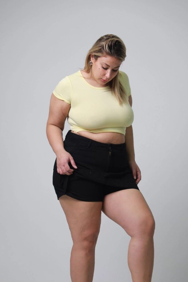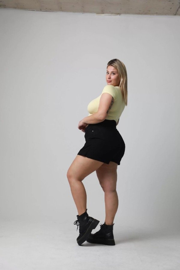 Rigido, tiro alto, bolsillos delanteros y traseros. Tiene una solapa delantera que simula una pollera.