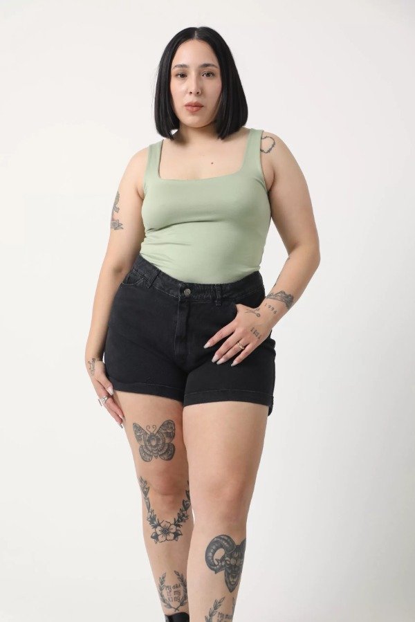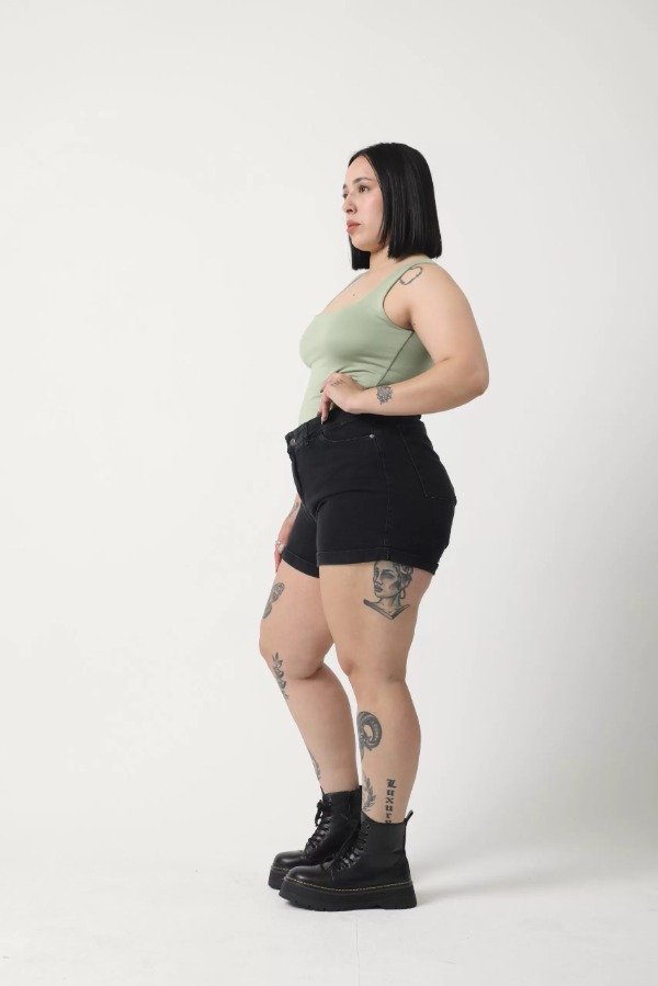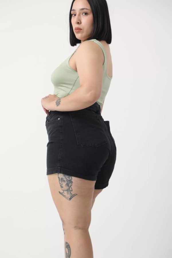 Short de denim gris oscuro gastado.