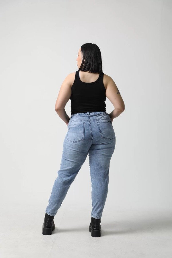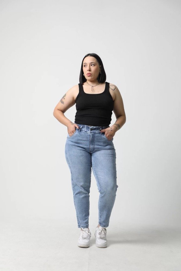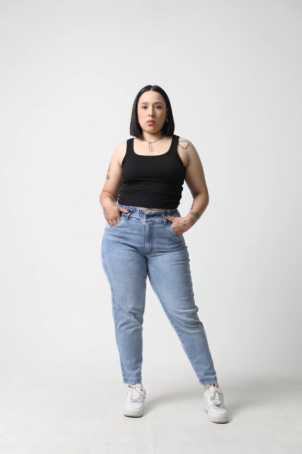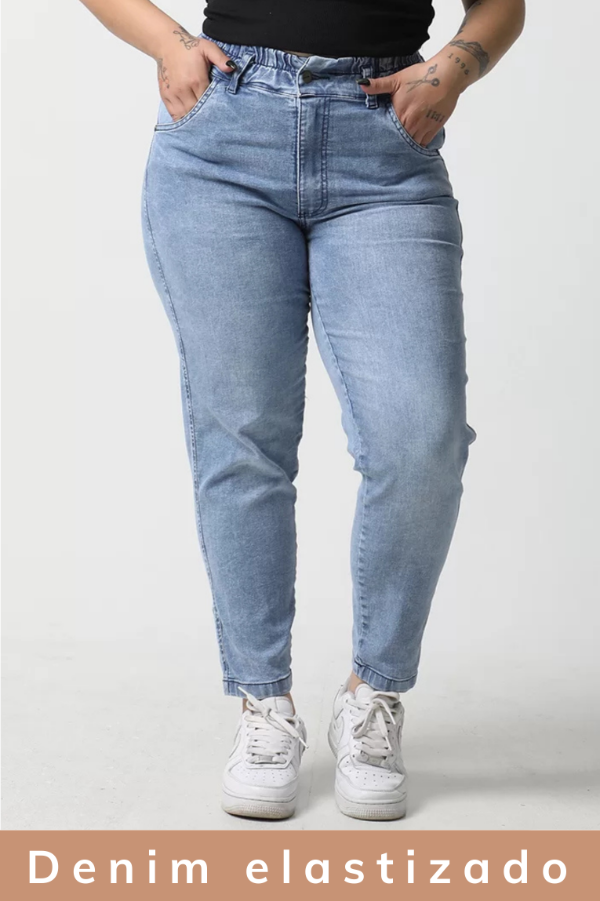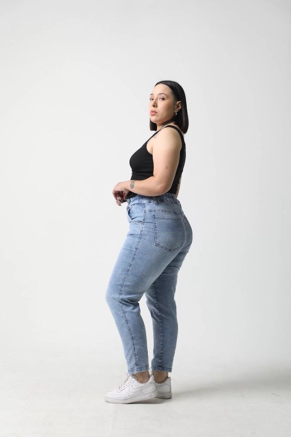 Tiro alto, bolsillos delanteros y traseros, ruedo normal. Elastico en toda la cintura.