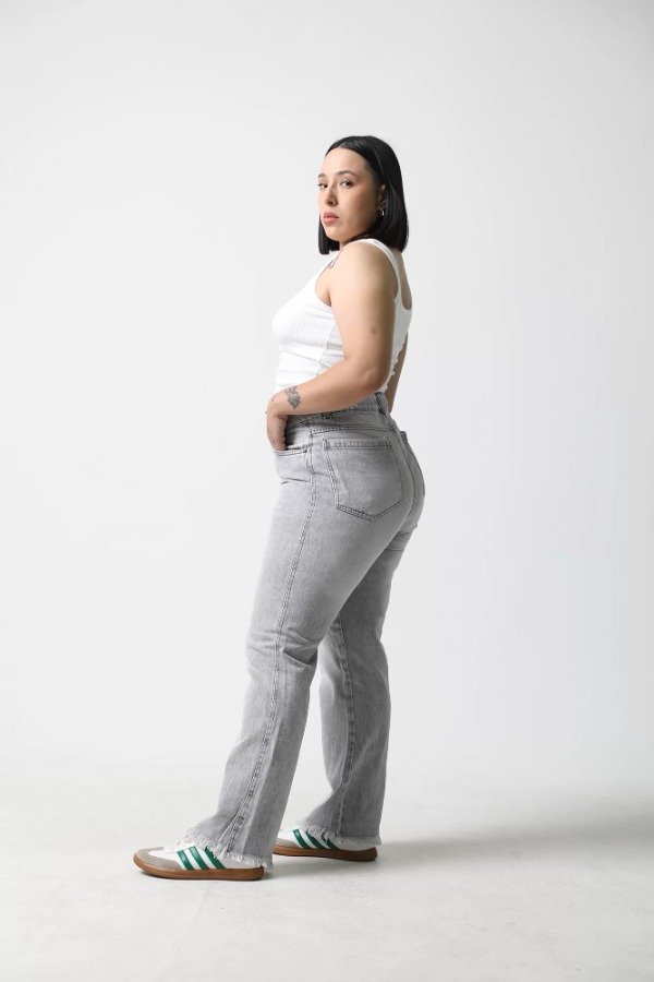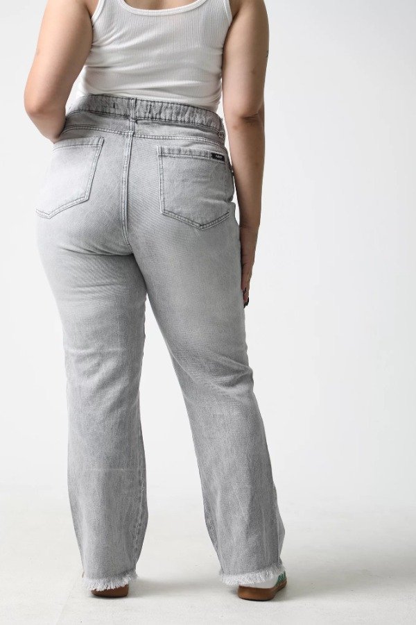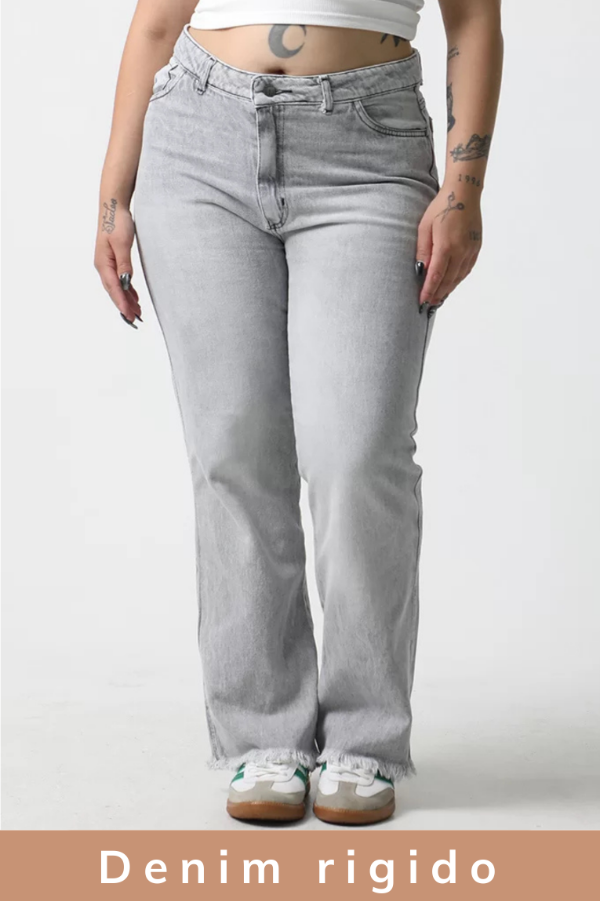 Rigido, tiro alto, bolsillos delanteros y traseros, ruedo irregular desflecado.