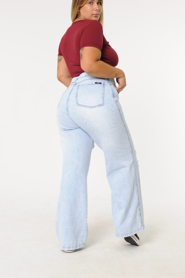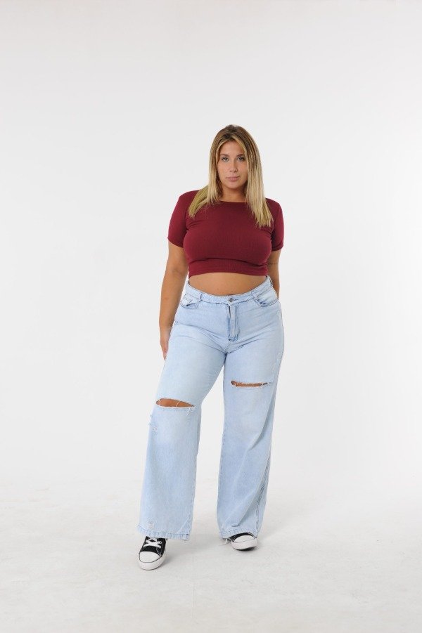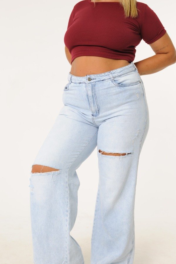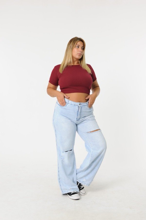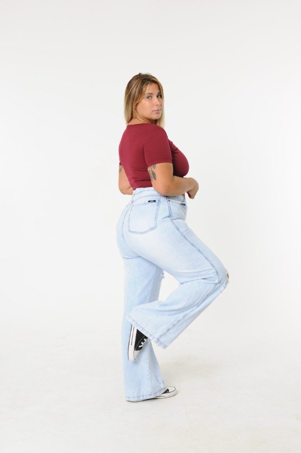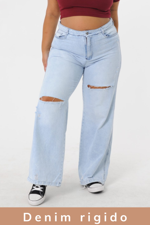 Rigido, tiro alto, bolsillos delanteros y traseros, roturas en las rodillas. Corte clásico.