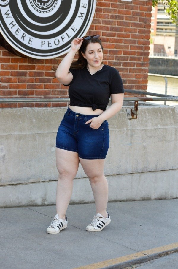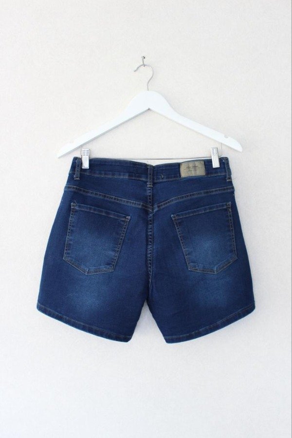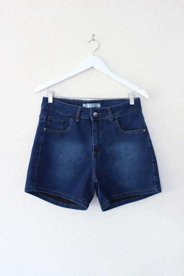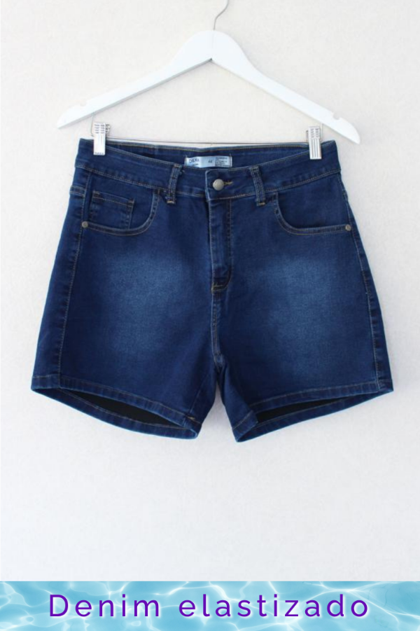 Denim azul oscuro, elastizado, tiro alto, bolsillos delanteros y traseros