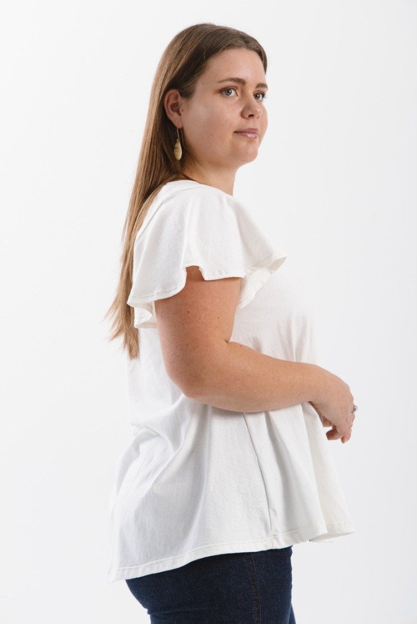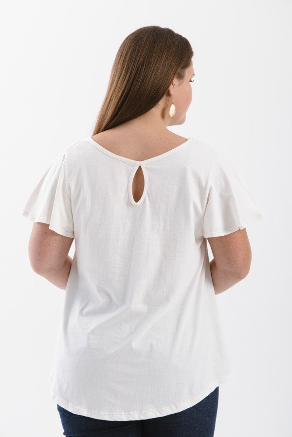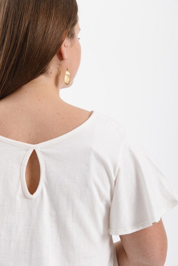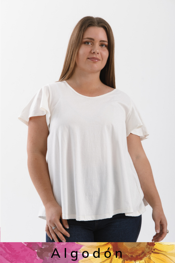 Tela semielastizada, cuello redondo, volados en las mangas, semievase, detalle de gota en la espalda.
